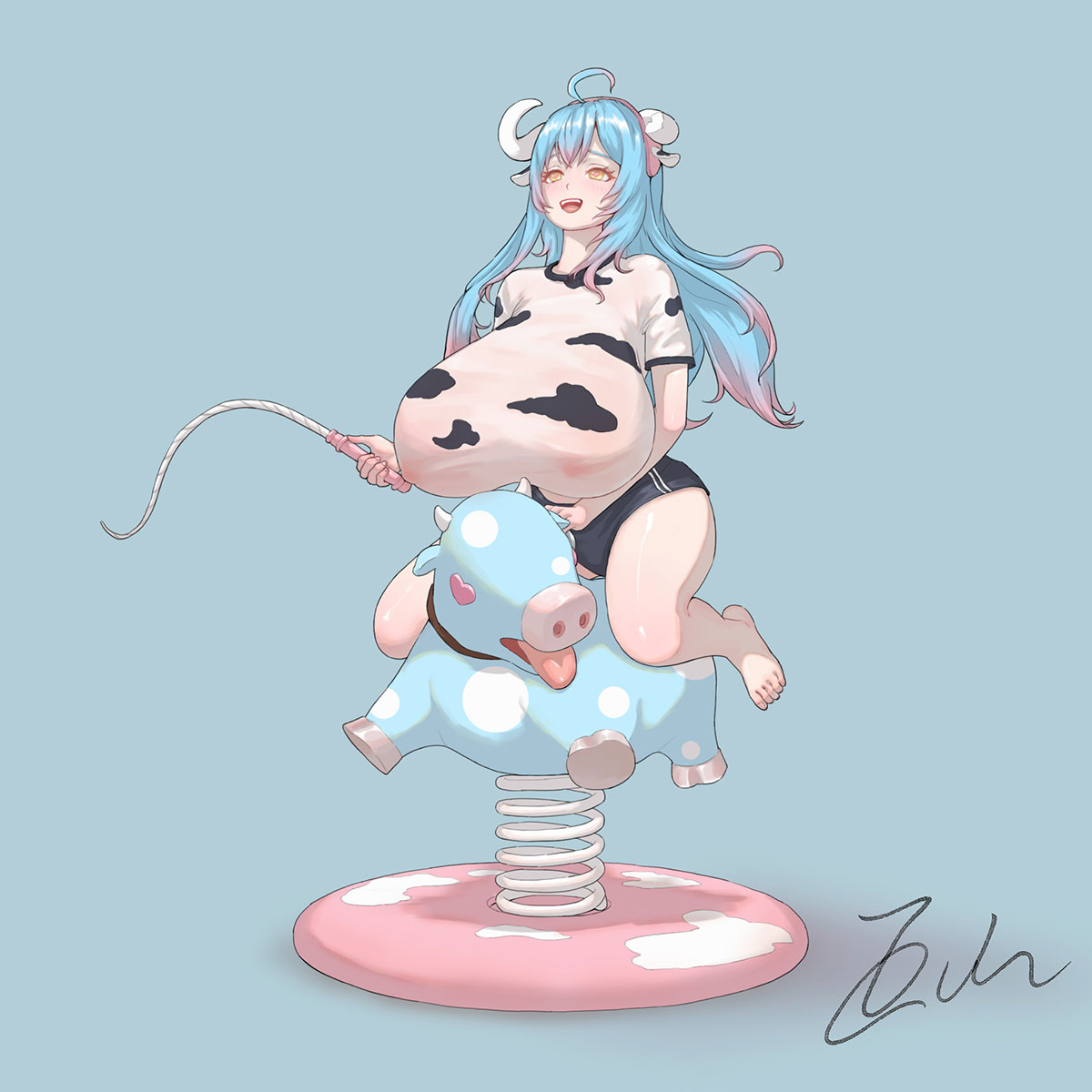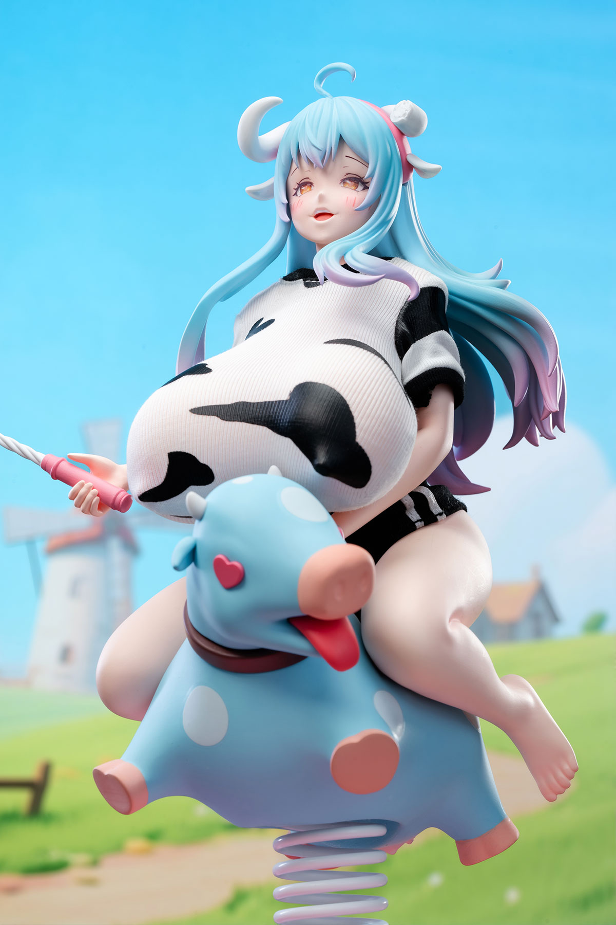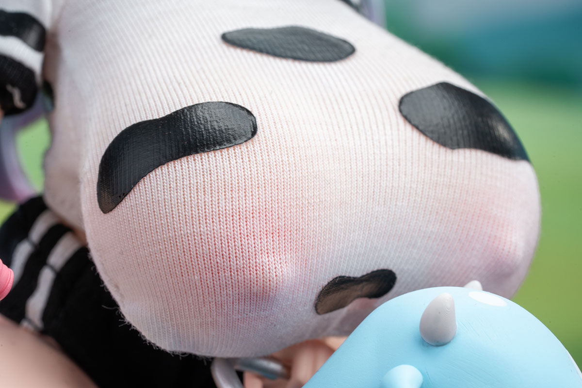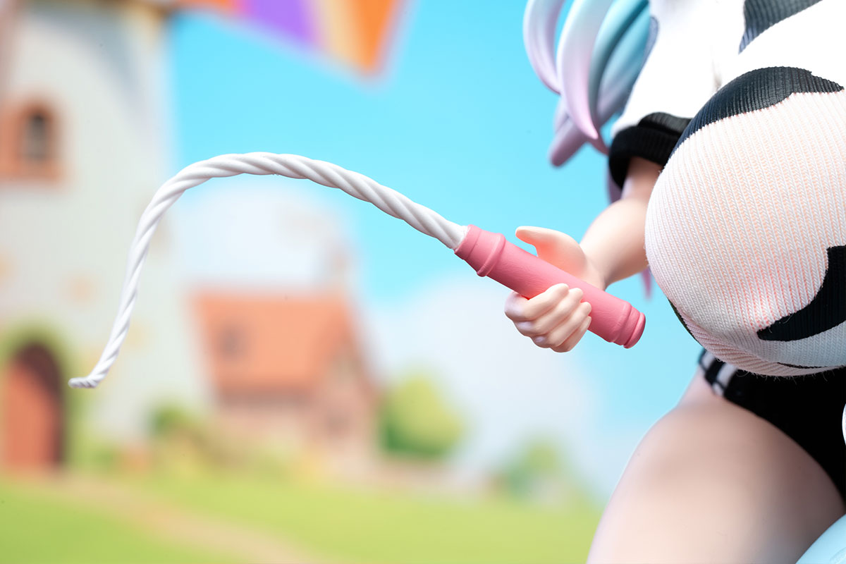 着けている牛柄体操着とブルマは布製で、めくったりズラして楽しむことが出来ます。また、台座のスプリングにより全体がゆらゆらと可動します。全高は約21cmのビッグボリューム。